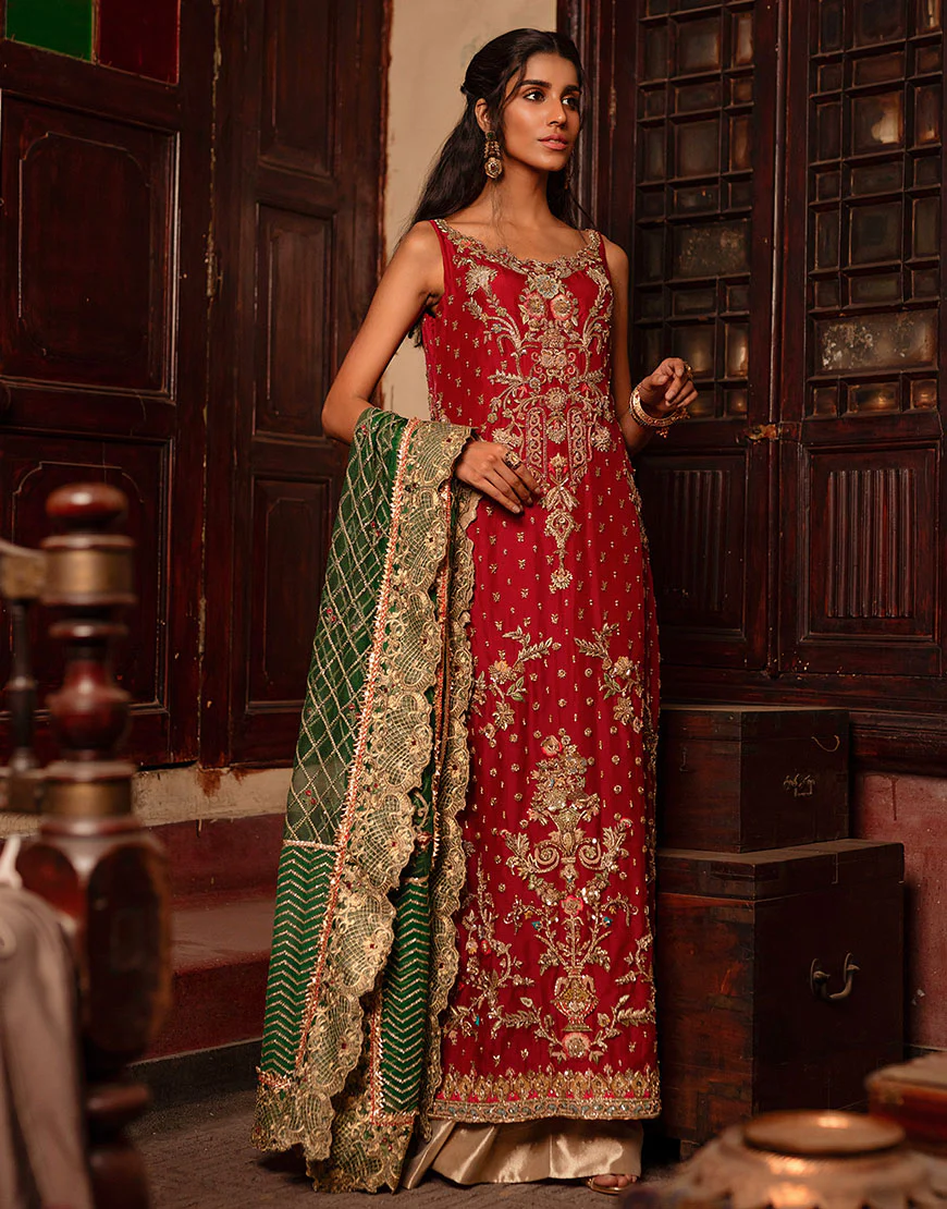 Description:Â A crimson red shirt. This long shirt features floral trellises and bouquets, bejeweled and hand embroidered on a pure raw silk base using dabka, sequins, resham and zardozi. Its paired with a tissue sharara and an emerald green tulle scallaped dupatta featuring chevrons rendered using sequins.