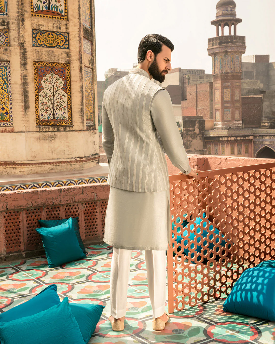 An immaculately crafted cloud grey waistcoat using a fine streaky fabric is paired with a similar hued kurta. The set is completed with a neatly cut straight trousers in white.