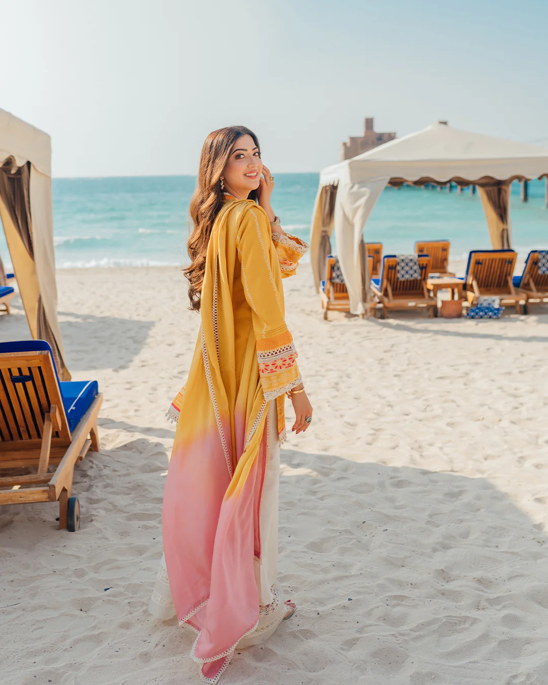 The orangish yellow silk shirt features a gorgeous delicate print in white and pink. It’s adorned with pearl embellishments and crochet trimmings on the neckline and hem. Paired with a two tone silk dupatta and lace detailed white trousers.