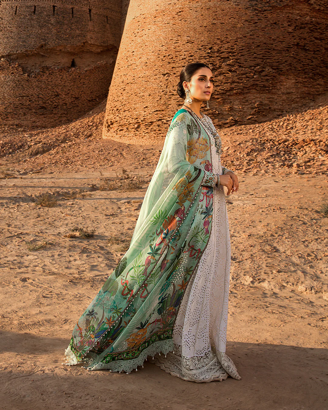 An impressive chikankari fabric is employed to create Faiza Saqlain’s most coveted silhouette for Hala. Featuring a gorgeous assemblage of laces and embroidered borders on sleeves and hem this number comes with a Chiffon dupatta which is a true botanical dream.