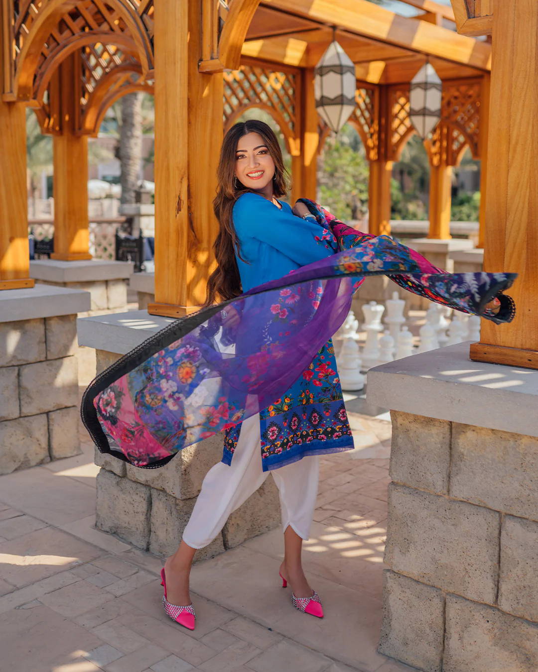 An ultimate floral dream inspired by the aquatic beauty, this silk set is rendered in an azure blue tone featuring printed florals in bright hues. Embellished with pearl brooches, organza and crochet trimmings itβs paired with a similar digitally printed dupatta and a plain white tulip shalwar.