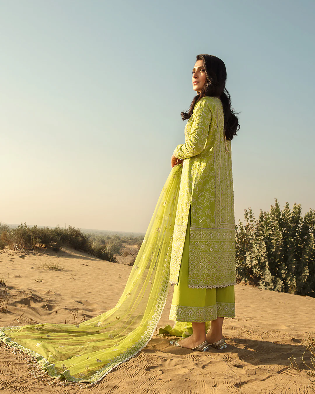 An exuberant lime green lawn is the canvas for Lara. Delicately embroidered into dainty florals with a dazzling creamy thread this number is a head turner. Elegant blooms are sewn on the net dupatta bordered with fine embroidery and lace embellishments.