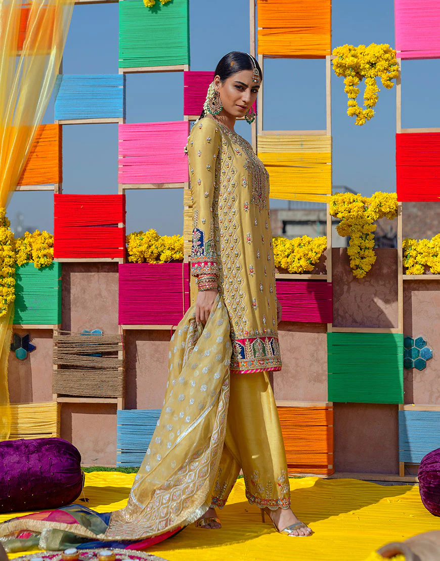 Description: The daffodil yellow raw silk kurta shalwar. The set is handcrafted with naqshi, zardozi, sequins and stones. Tukdi work is the highlight of this shirt, its border being derived from archival subcontinental carpets is crafted using naqshi, sequins and resham on patches of multi hued silk.It’s paired with an organza dupatta crafted to perfection to complement the set.